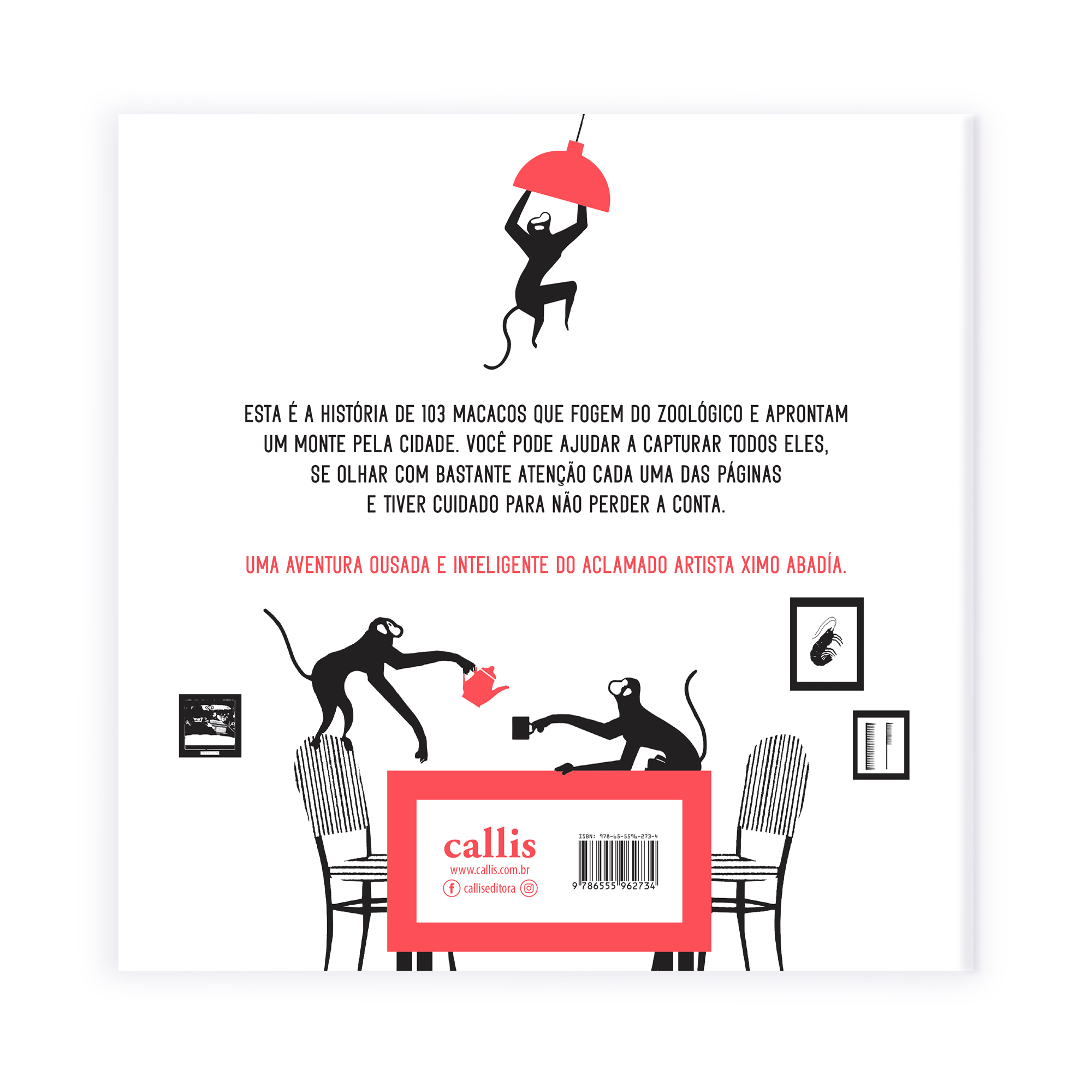 Esta é a história de 103 macacos que fogem do zoológico e aprontam muito pela cidade. Eles passeiam no parque, tomam chá na casa da senhora Starobinski, formam uma banda e até vencem uma partida de futebol. Você pode ajudar a encontrar todos eles, se olhar com bastante atenção cada página e tiver cuidado para não perder a conta. Uma aventura ousada e inteligente do aclamado artista Ximo Abadía.