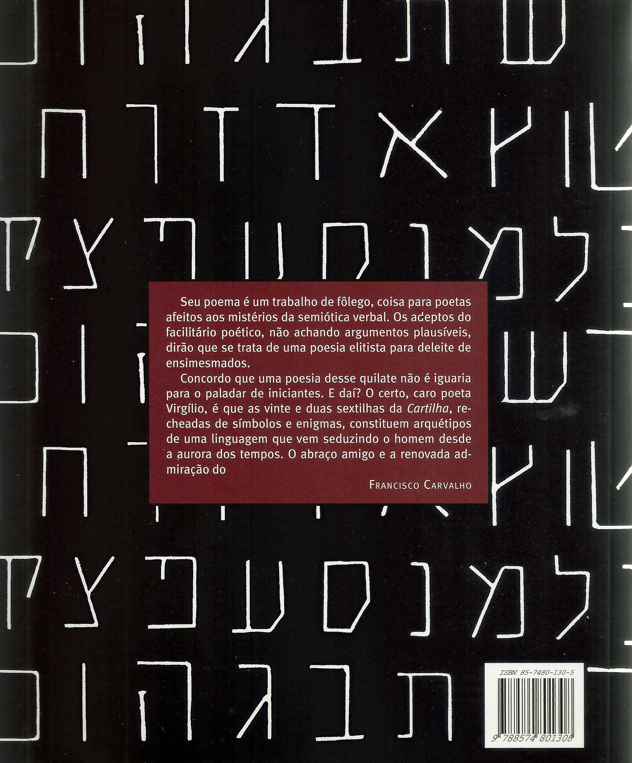 Alguns cristãos-novos que vieram ao Brasil marcavam símbolos hebraicos, a ferro, na coxa direita dos bois. Além de identificar o rebanho, essa era uma forma de manter a tradição judaica. Eis a fonte criativa dos 22 poemas deste livro, escritos com base no alfabeto hebraico, cujas letras representam um número e carregam um significado. O processo usado por Virgílio Maia incluiu xilogravura, tipografia e outras técnicas. Usando-as de modo experimental e singular, fez do velho surgir o novo.