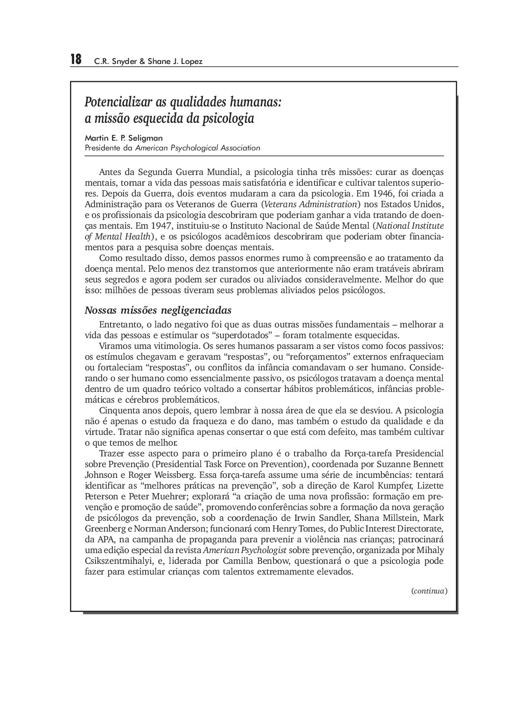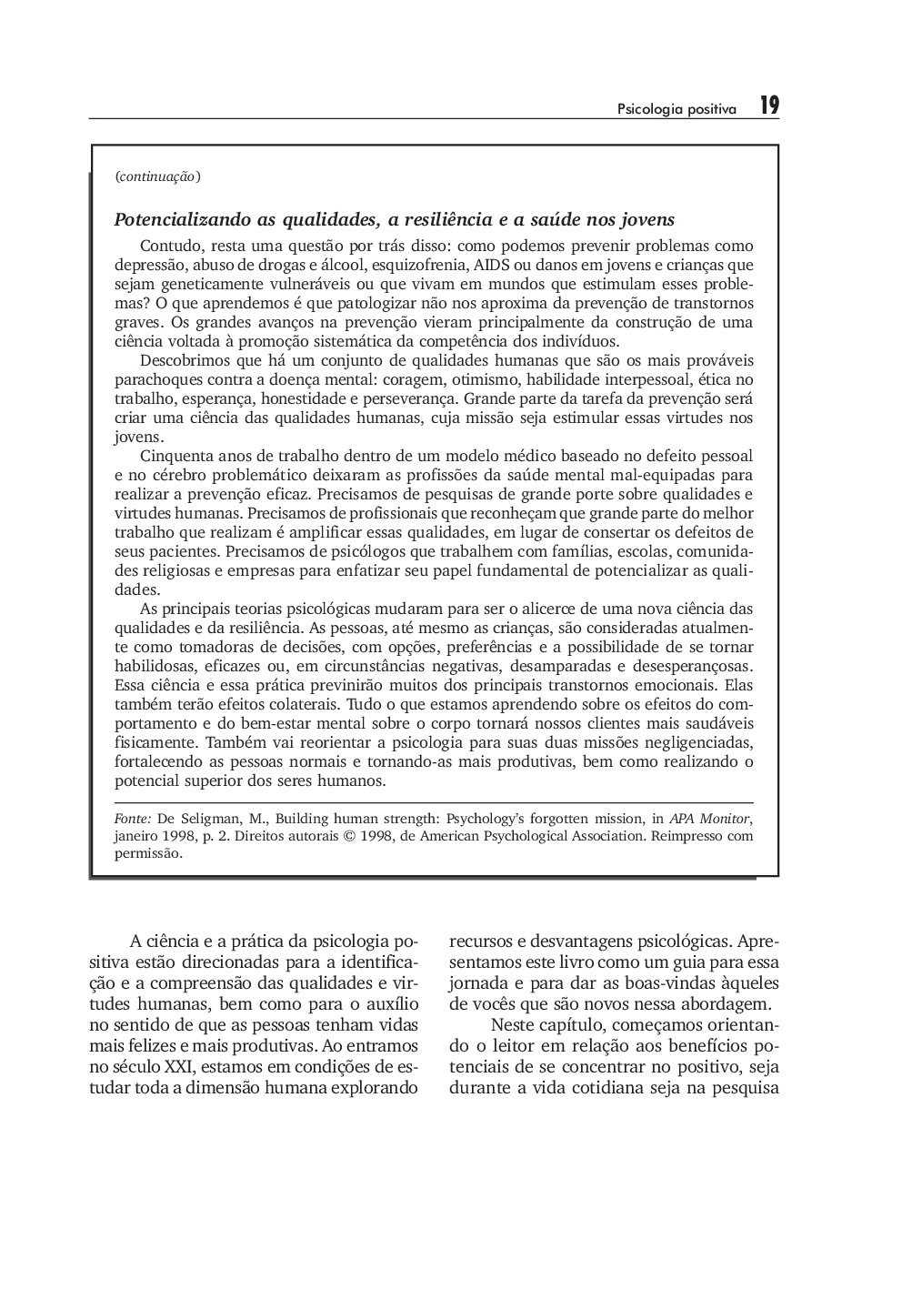 Escrito por pioneiros da Psicologia Positiva, este livro apresenta aos leitores esse novo paradigma cientifico que se centra na promocao da saude e do bem-estar das pessoas. Por meio de uma revisao bibliografica abrangente e de exercicios bem elaborados, esta obra ajudara o leitor a compreender e testar os principios dessa abordagem inovadora, que ultrapassa a visao psicopatologica vigente e propoe uma reformulacao do estilo de vida, visando uma existencia mais feliz.