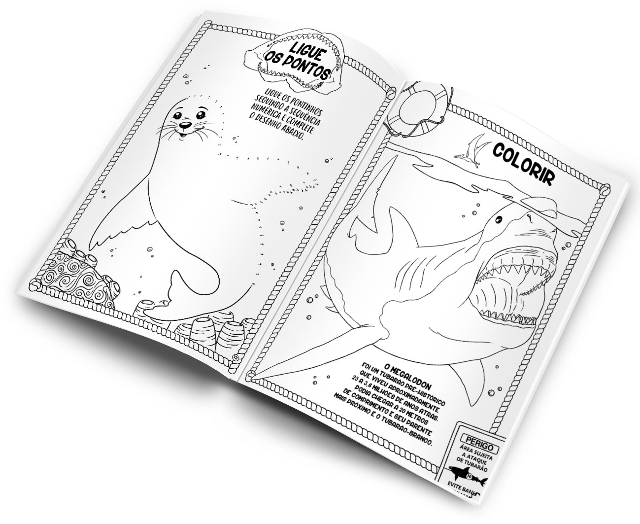 Viva uma aventura marinha com 100 páginas de desenhos radicais para colorir e atividades sobre os ferozes tubarões!